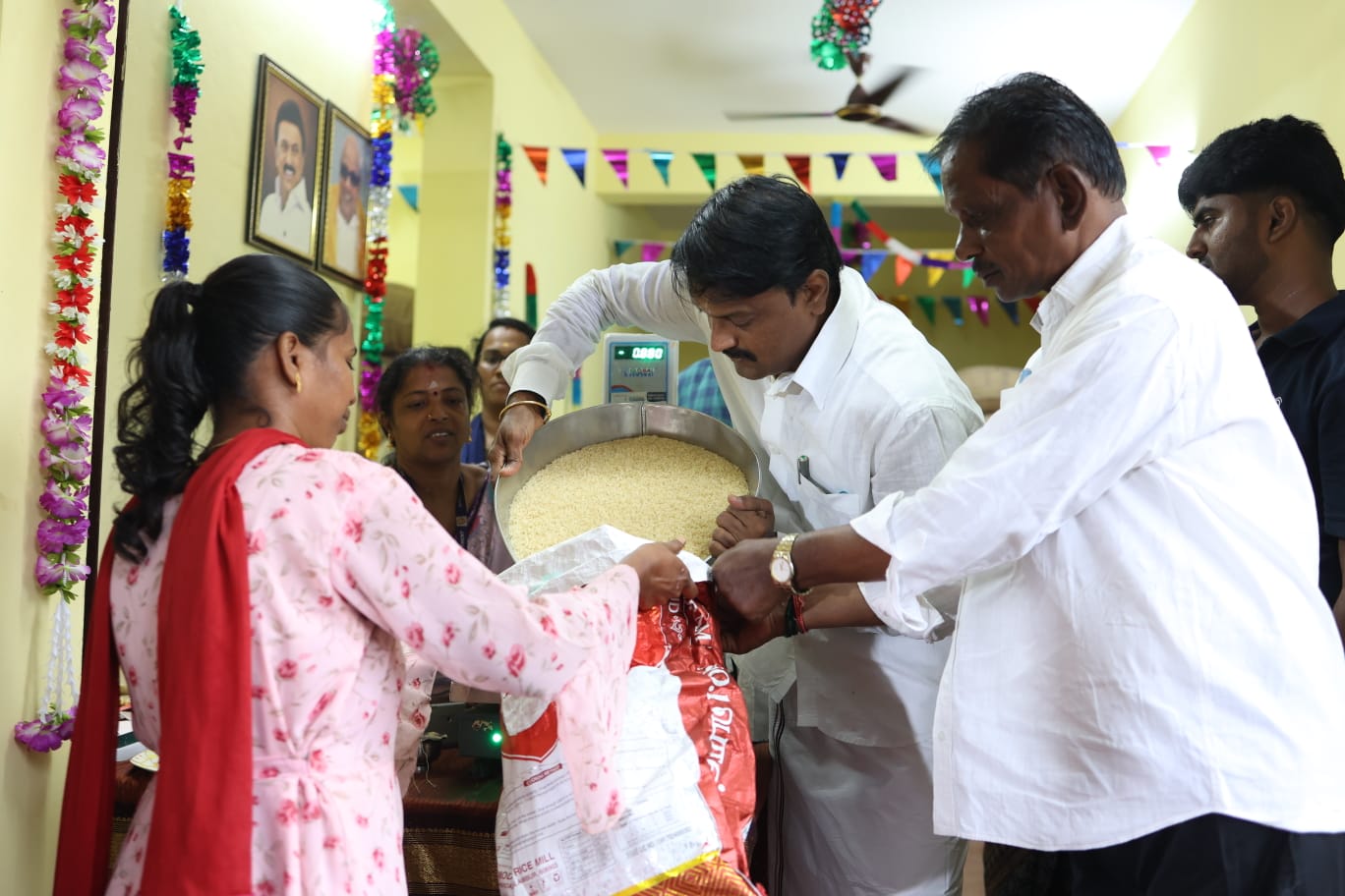 After the inauguration, Councillor Kathir Murugan personally distributed essential goods, including rice, sugar, dal, and oil, to the public.
