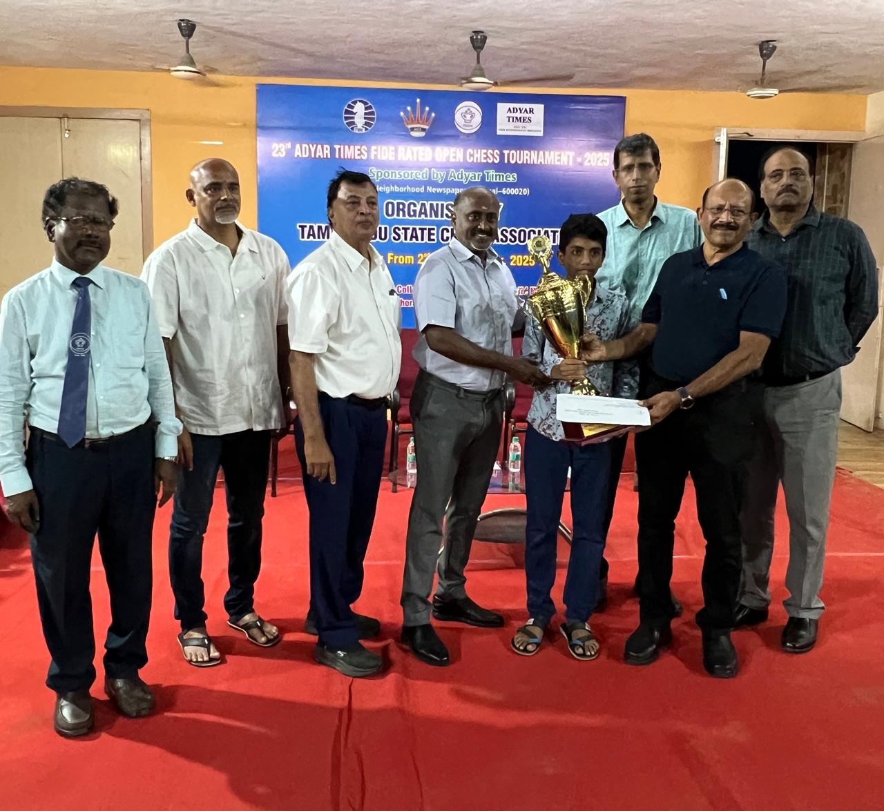 The champion received the glittering Adyar Times trophy and a winner’s purse of Rs. 35,000. Two-time champion T. Hari Ganesh, also finishing with 7 points, was the runner-up, followed by A. Lukesh in third place.