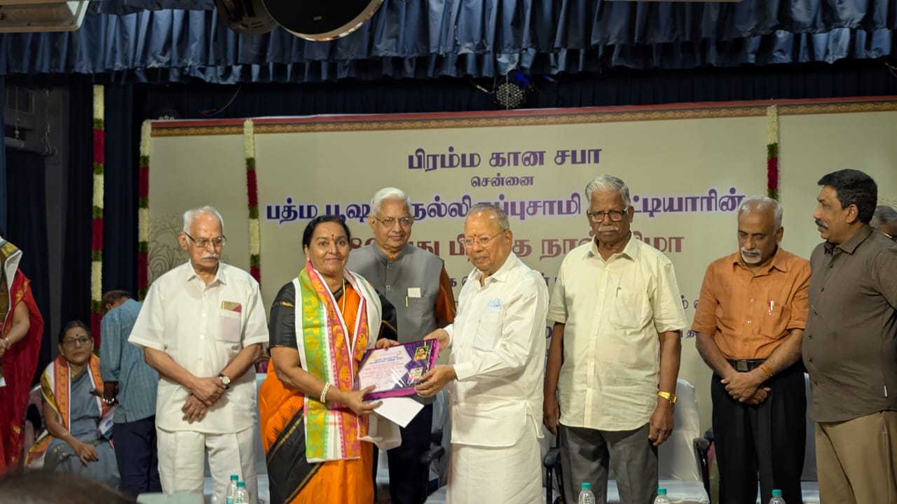 The award was presented during the celebration of Sri Nalli Kuppuswamy Chetty’s 86th Birthday, hosted by the Nalli Thisai Ettum magazine on November 9 at Narada Gana Sabha, Chennai.