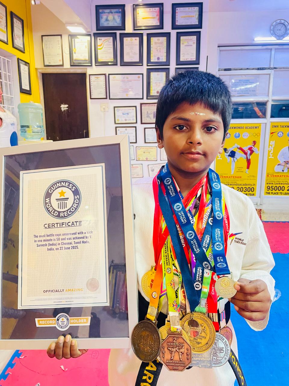 In a remarkable display of precision and speed, V. Sarvesh of the Chennai OMR Taekwondo Academy has entered the Guinness World Records by successfully opening 50 bottle caps with kicks in one minute.