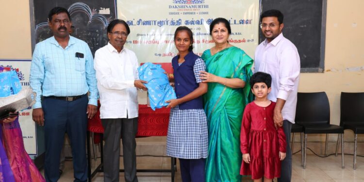 Dakshinamurthi Educational Trust, Adyar, under the stewardship of its Managing Trustee Kalaimamani Nirmala Periyaswamy, sponsored and distributed cash prizes and certificates to the students of Arignar Anna Government Higher Secondary School, Urur, Besant Nagar, who excelled in the Tamil Ilakiya Mandram Competitions.