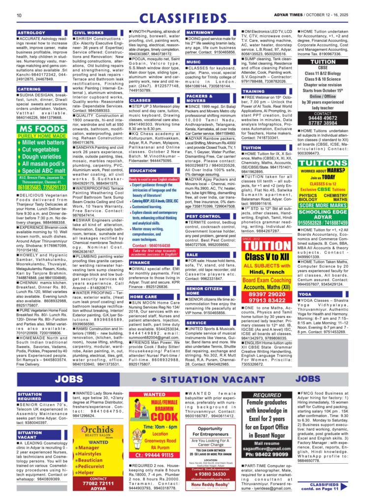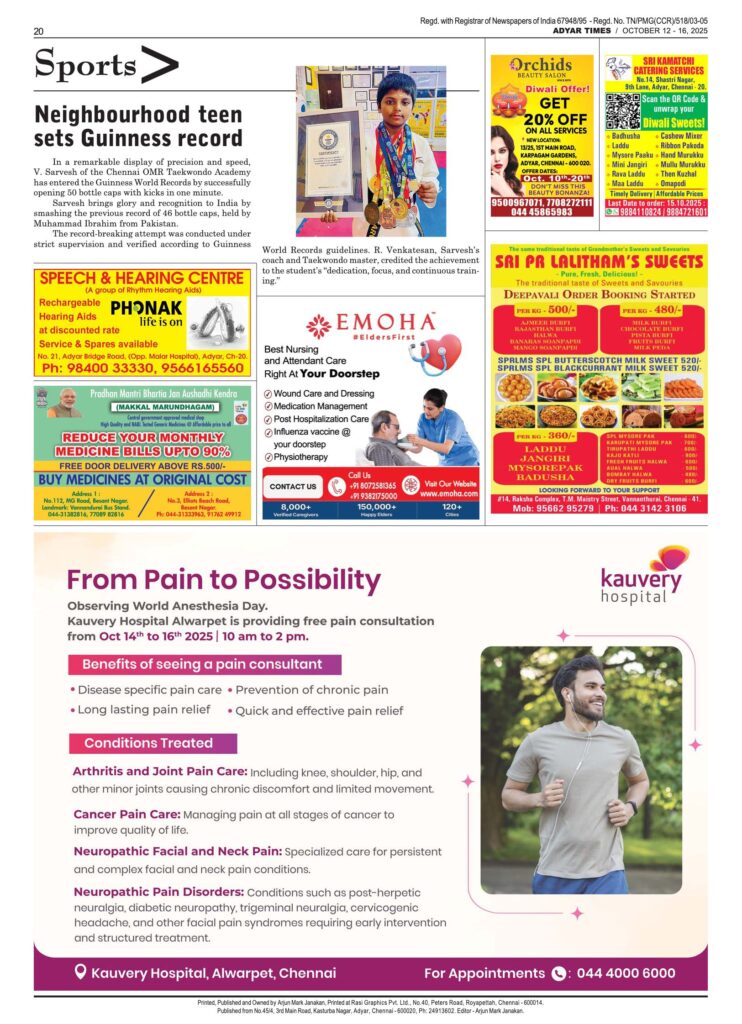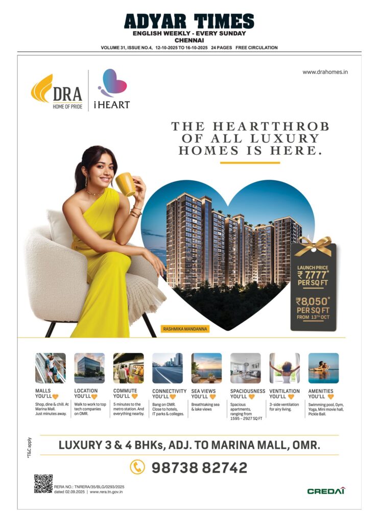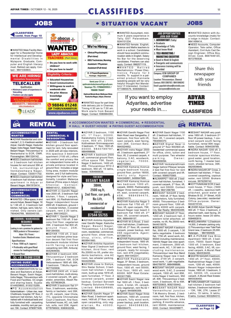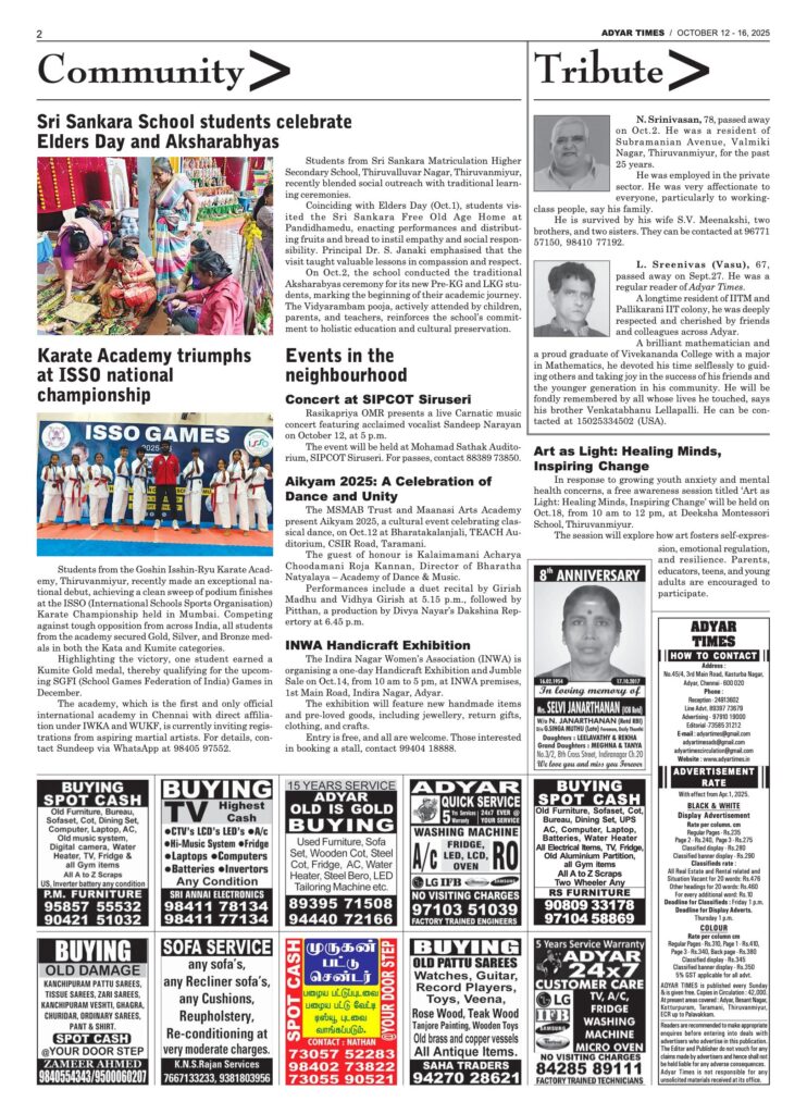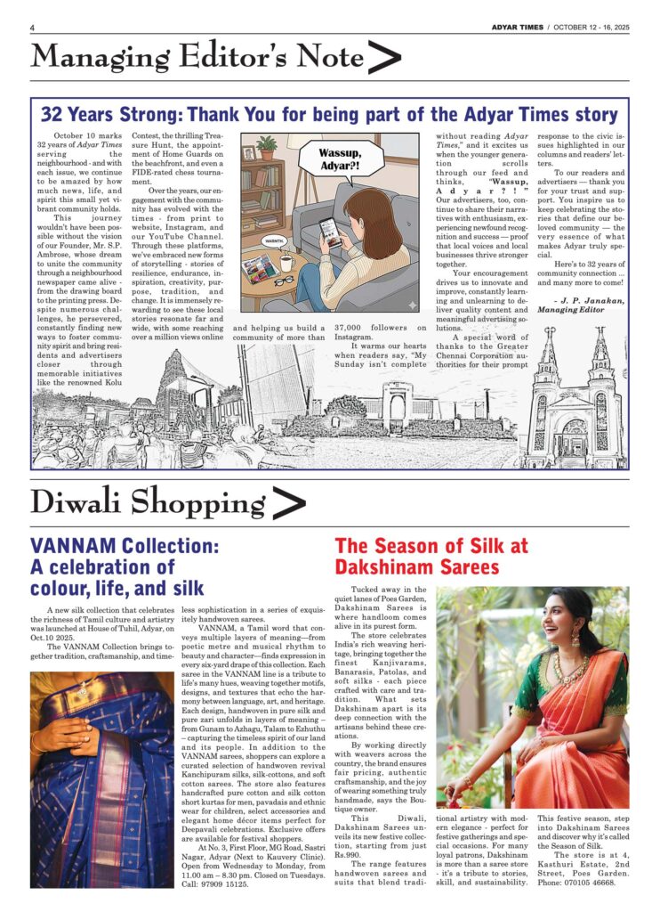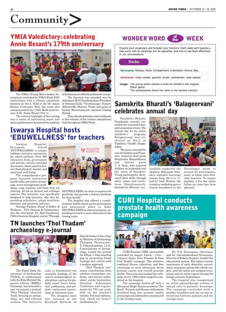 Adyar Times was established in Chennai in the year 1993, founded by Mr.S.P.Ambrose, IAS (Retd.). The concept of a newspaper for the neighbourhood was a novel idea then. The English weekly (Sunday) now boasts a circulation of 42000 copies with an average of 16 pages per issue.