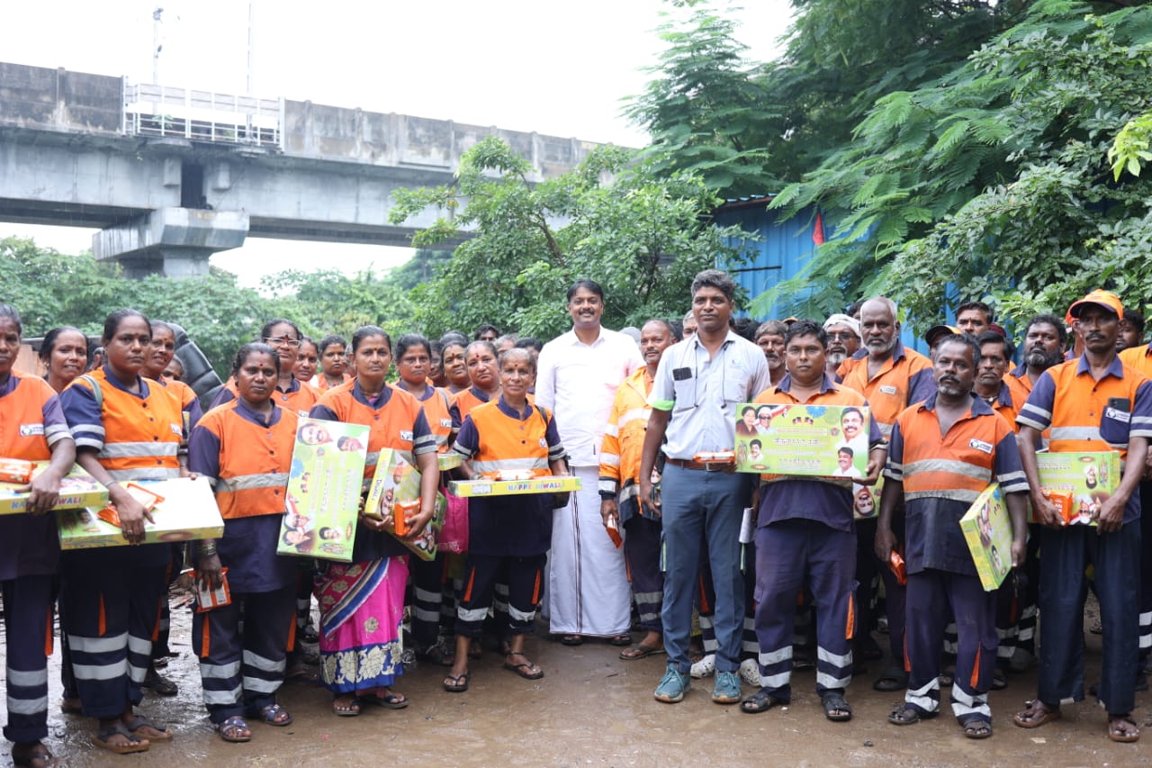 The councillor personally ensured the festive cheer reached essential service providers, including the Greater Chennai Corporation health and sanitation workers, conservancy staff, UPHC nurses, CMWSSB staff, TANGEDCO employees, and Amma Unavagam staff.