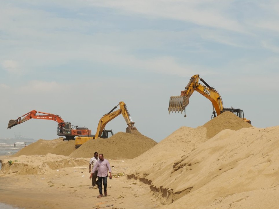 The current focus at the Adyar estuary is on widening the mouth, which was previously only 150 meters wide, to 250 meters using three excavators. These machines will work until the monsoon concludes.